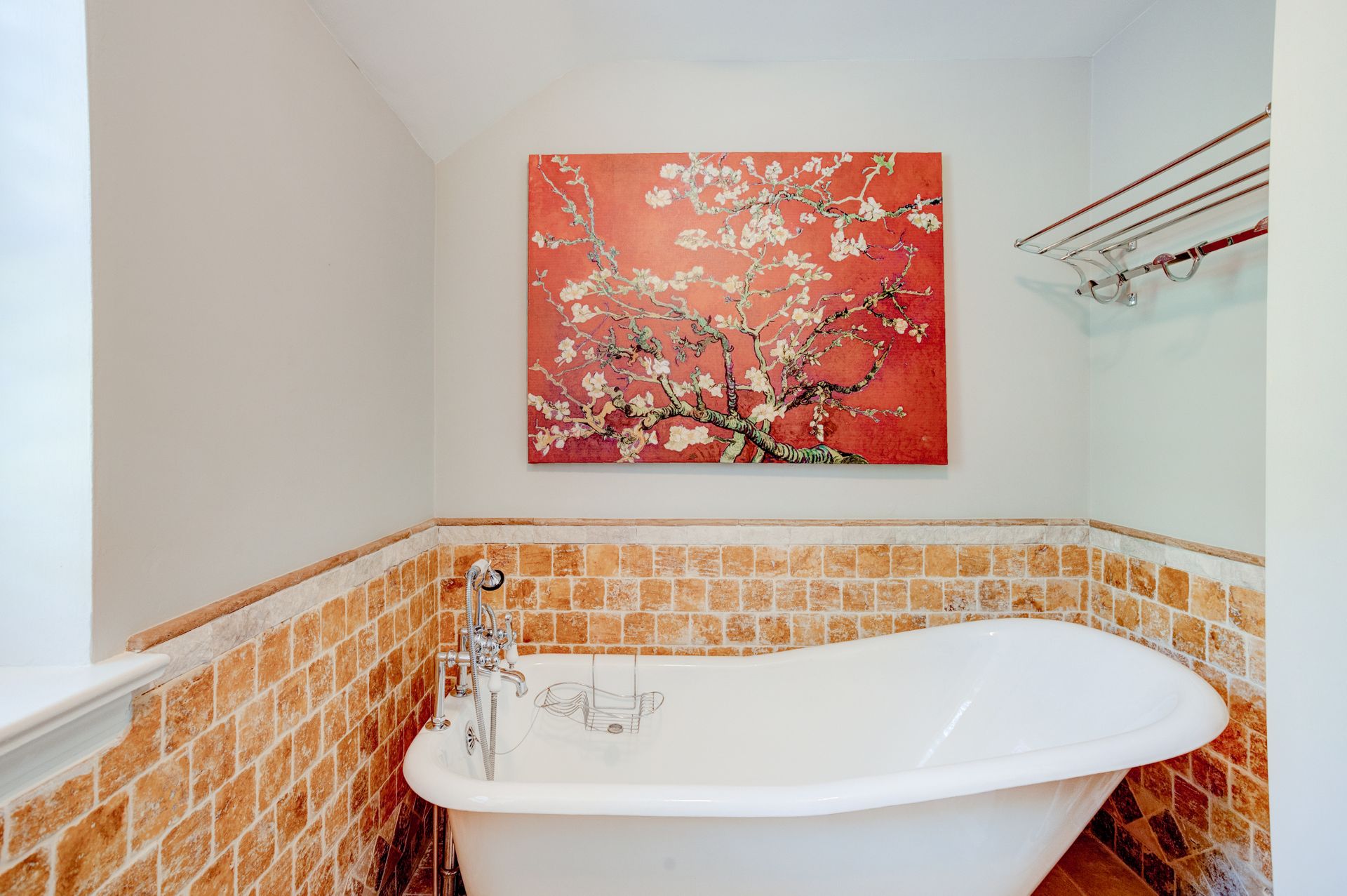 Upstairs, the primary bedroom suite is a serene retreat, with an amazing ensuite bathroom featuring twin vanities, quartz counters, a tiled stall shower, clawfoot tub, and a private water closet. Two additional bedrooms, currently configured as a media room/library and a large walk-in closet, offer great flexibility. A second hallway, located beyond these rooms, leads to an upgraded hall bathroom featuring marble floor tile and a glass shower enclosure. A guest suite with a full bath, including a clawfoot tub, completes the upper level.