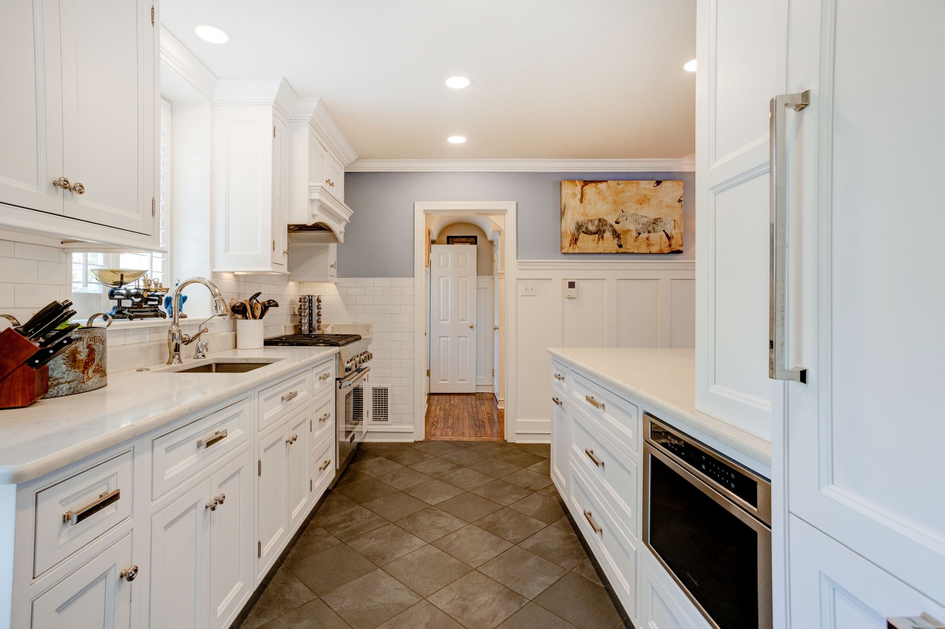 The dining room opens to a cook’s dream of a custom kitchen, with quartz counters, gas cooking, subway tile backsplash, and high quality Thermador appliances. A first-floor powder room is situated in the center hall for added convenience.